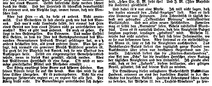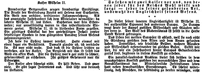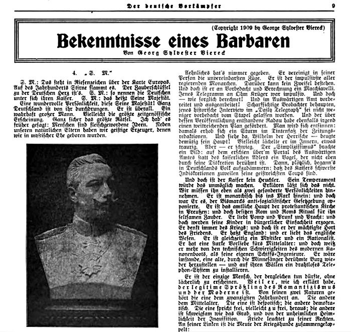 George Sylvester Viereck Kapitel "S. M." über Kaiser Wilhelm II. aus dem Abdruck der "Bekenntnisse eines Barbaren" in der Zeitschrift "Der deutsche Vorkämpfer" von Louis Viereck, 1908: Titelblatt: ![]() Seite 9: