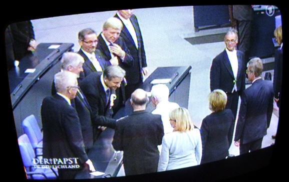 Opus-Dei-Papst gibt Sado-Maso-Wowi die Hand, Wowi von oben herab und servil. In seiner Rede beschwor der Papst "die Fähigkeit, Gut und Böse zu unterscheiden und so wahres Recht zu setzen, der Gerechtigkeit zu dienen und dem Frieden." Und zu Wowereit gewandt: "Und übrigens haben wir schon gefoltert, als der rote Stöckel- schuh noch nicht erfunden war!" (Nein, das ist gar nicht wahr, den letzten Satz haben wir erfunden, nachdem wir die Fläsch Chateau Neuf du Pape jedronke hann.) Der Papst wiederholt in seiner Bundestagsrede im Wesentlichen den Inhalt seiner lesenswerten "Regensburger Rede" von vor fünf Jahren, ohne diesmal auf den Islam einzugehen: Judentum, Helenismus, Römisches Reich als Quellen seines Katholizismus. Diesmal setzt Ratzinger, der vormalige Großinquisitor, der immer behauptet, erst die überaus grausame und willkürliche "Heilige Inquisition" habe den juristischen Prozess als generelles Regelwerk in die Zivilisation implementiert, wobei er gerne die Millionen Ver- brannter und zu Tode Gequälter verschweigt, vor den Abgeordneten des Gesetzgebers auf "das Recht", das in Wahrheit doch eine Errungenschaft der römischen Kirche sei: "Die Kultur Europas ist aus der Begegnung von Jerusalem, Athen und Rom – aus der Begegnung zwischen dem Gottesglauben Israels, der philosophischen Vernunft der Griechen und dem Rechtsdenken Roms entstanden. Diese dreifache Begegnung bildet die innere Identität Europas." Man vermisst angesichts der Wirklichkeit der Sklaven- haltergesellschaften Griechenlands und erst recht Roms, das sich in Circus und Colos- seum mordsmäßig amüsierte, den Liebesaufruf Jesu (det mit de Wange, wa), der in den Gesängen der Frühchristen erklang, bevor sie von den Löwen zerrissen wurden. Aber mit der Botschaft, Gott liebe die Menschen, hat es der Inquisitions- und Opus- Dei-Papst nicht so; obwohl er gekommen ist mit dem Anspruch, Gott ins Leben der Menschen zurück zu holen, hört man diese Botschaft von ihm nicht. (Und kaum haben wir das geschrieben, da baut er in seiner Freiburger Predigt prompt "die Liebe Gottes" doch noch in einen Nebensatz ein; denn hier spricht er zum Kirchenvolk und über die Altenpflege der Caritas. Und so bleibt alles, wie es war: dort die Herrschaftskirche des Inquisitors, hier die Volkskirche, die abverlangte Demut als Liebe verkauft.) Denn es geht um Macht, und wer nicht mit-macht, wird verbrannt. Die Erinnerung an das römische Recht auf grausame Folter, willkürliches Töten, solange man den Men- schen zum Sklaven definiert hat, und an den Spaß daranund an die Inquisition, die darauf fußte, erleichtert den Fortgang des Berlin-Besuchs. Papst