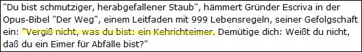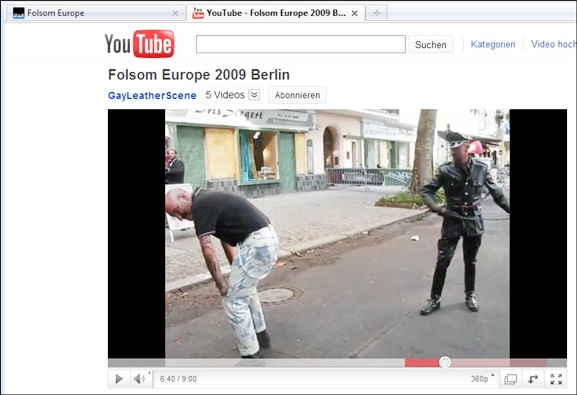Unten: Modell "Folsom" mit wesentlich mehr Schwänzen als die Opus Dei-"disciplina", erhältlich beim "Folsom Europe Berlin"-Finanzier "Mr B": ![]() BIFFF...-Screenshot von der "Mr. B"-Webseite. Das niederländische Unternehmen aus Amsterdam mit Zweigstelle in Berlin, die laut "Spiegel Online Archiv" gleich um die Ecke einer Opus Dei-Dependance liegt (man möchte es ja kaum glauben: zwischen dem Haus der heutigen "Folsom Europe"-Adresse, gleich um die Ecke des Berliner "Mr B"-Shops, und dieser Opus Dei-Zweigstelle, die "Der Spiegel" nannte, sollen ganze vier Häuser liegen! Aber der "Spiegel" wusste noch nichts von "Mr B"'s "Iron Whips", als er das schrieb) finanziert wesentlich das "Folsom Europe Berlin"-Straßenfest der überwiegend schwulen Sado-Masochisten, das durch den Regierenden Bürgermeister Klaus Wowereit seit 2004 unterstützt wird. "Folsom Europe"-Mitgründer und -Vorstand Robert Kastl, auch Chef des Berliner CSD e.V., ist einer der Sprecher des Berliner Anti-Papst-Bündnisses im September 2011. Warum nur? Wo doch das Opus Dei des Papstes gleich in der Nachbarschaft einkaufen könnte! Viel effektiver sind die Prozeduren in Gemeinschaft, von denen Wowereit dem Papst aus der "Folsom"-Szene berichten kann. "Lebensfreude pur" nannte Wowereit das im Jahr 2005 in dem "Folsom Europe"-Werbeheft für das Berliner SM-Straßenfest, das solche Szenen zeigte: ![]() Oben: Werbung von "Mr B" im "Folsom Europe"-Heft 2005 mit Wowereit-Grußwort "Lebensfreude pur": "verherrlicht sei Schmerz" (Escrivá). Unten: Screenshots aus einem "Folsom Europe"-Werbefilm bei YouTube: ![]() "In den Arsch! In den Arsch!": Fetisch-Nazi gibt's dem Skinhead mit der einschwänzigen disciplina beim "Folsom Europe Berlin"-Straßenfest 2009 nach Maßgabe des Masters Escrivá. ![]() Zum Lachen ist das alles nicht. Es ist Menschenverachtung pur. Beim "Folsom Europe Berlin"-Straßenfest werden Menschen zu Tieren degradiert, kriechen an Hundeleinen über die Straße und durch die Gosse. Herrjesus hatte anderes im Sinn mit den Gottes- kindern, glaubt man seiner Bergpredigt. Demütigungen wie aus dem Domina-Salon hat auch Escrivá in seinem Buch "Der Weg" für alle parat, die so drauf sind wie er: ![]() In der "Dialektik der Aufklärung" schrieben Max Horkheimer und Theodor W. Adorno, im Kapitel "Juliette oder Aufklärung und Moral", dem Kapitel über die Gesellschaftskritik des Donatien Alphonse Marquis de Sade: "Erst an der ausweglosen Verzweiflung des Opfers wird Herrschaft zum Spaß und triumphiert im Widerruf ihres eigenen Prinzips, der Disziplin" (DdA 1988, S. 120). Ratzinger in Berlin erinnert an den Papst, den de Sade erdacht hatte: den de Sade die Widerlegung des Fünften Gebotes selbst vortra- gen ließ und der der de Sadeschen Vernunft nichts mehr entgegenzusetzen hatte. Als hätte es eines solchen Papstes nach Pius XII. noch bedurft! Und dieser Papst kommt sogar wegen sich selbst nach Berlin, anders als Pius VII., der 1804 nach Paris reiste, um als bloßer Statist an der Selbstkrönung Napoleons teilzunehmen; der Opus Dei- Papst Benedikt XVI. feiert sich selbst! Und weil er in der Bedrouille ist, gibt er sogar Wowereit die Hand, dem sündigen Schaf, auch ohne vorherige Beichte und Absolution? "Mehr noch als der Preußengott hält es die römische Vernunft mit den stärkeren Bataillonen", schrieben Horkheimer und Adorno (S. 124). Päpstlicher als der Papst: Klaus Wowereit lobt Jesus-Dildo-Straßenfest In seinem "Grußwort" zum Sado-Maso-Straßenfest 2011 bezieht sich Klaus Wowereit ausdrücklich auf das Vorbild in San Francisco, wo die "Folsom Street Fair" geboren wurde, deren billiger Abklatsch als "Folsom Europe Berlin" stattfindet. Die Berliner mussten angeblich unterwürfigst um die Namensrechte nachsuchen, die ihnen die Kalifornier gnädigst überließen, und präsentieren das Straßenfest in San Francisco alljährlich als Sponsor des Berliner Ablegers. "Folsom