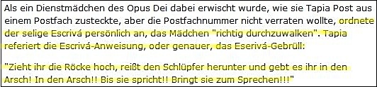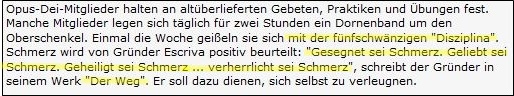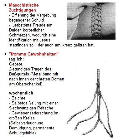 Seit langem ist bekannt, dass sich im Opus Dei Sado-Masochisten sammeln, die - den Befehlen ihres Meisters Escrivá gehorchend - gegen sich und andere Menschen sado- masochistische Praktiken ausüben. Körperlichkeit