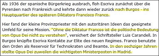 Sado-Maso ohne Ende! (Dogma) Wir zeigen hier die Instrumente. "Jetzt kommt, wächst, fügt sich zusammen, was zusammen gehört", war immer schon ein verunglückter sexualdemokratischer Appell. Wenn Berlins Regie- render Bürgermeister Klaus Wowereit und Papst Benedikt XVI. Josef Ratzinger zusammentreffen, zeigt er wieder seinen tiefen Sinn. Mehr als die Hälfte der Papst-Wahlberechtigten in der Kurie gehörten zum Freundes- kreis des Opus Dei, dem faschistischen Geheimorden des Vatikans. Wer direktes Mitglied des OD ist, bleibt geheim. Geschätzt wird, dass 60 der 115 Kardinäle, die bei der Ratzinger-Papstwahl abstimmten, dem OD nahe standen. Ratzinger selbst, dem Intellektuellen unter den Inquisitoren, wurde schon lange vorher die Ehrendoktorwürde der spanischen Opus Dei-Universität in Pamplona verliehen. Beim katholischen Welt- jugendtag in Australien 2008 war Ratzinger Gast des dortigen "Studienzentrums" des Opus Dei. Sein Privatsekretär Georg Gänswein, Titel "Päpstlicher Ehrenprälat", ist Gast- professor an der Opus Dei-Uni "Päpstliche Universität vom Heiligen Kreuz" in Rom. Das dem Papst direkt unterstellte "Werk Gottes" ist in Wahrheit ein Werk des spani- schen Faschisten Josemaría Escriba, der es 1928 als einfacher Priester gründete, der sich dann edelmännisch "Escrivá de Balaguer y Albás" nannte, der 1968 von seinem Caudillo, dem Mörder, Putschisten, spanischen Faschistenführer, Ziehkind und Freund Adolf Hitlers Francesco Franco als "Marques de Peralta" in den Adelsstand erhoben wurde und den schließlich 2002 der schon schwer kranke, geistig von seinem Ratgeber Ratzinger abhängige Papst Woytila heilig sprach. Der liturgische Festtag Escrivás, nun "Hl. Josefmaria", ist der 26. Juni, da wird besonders arg zum Heiligen gebetet. Mist, den Christopher Street Day, an dem die sexuelle Minderheit den Aufstand wagte, am 28. Juni hat er gerade so verpasst! Oder ist die Platzierung des heiligen SM-Predigers im Jahresablauf etwa so gemeint wie bei vielen christlichen Festen, wo man z. B. die Geburt Jesu knapp neben das heidnische Fest der Wintersonnenwende legte, Ostern zum germanischen Frühlingseierfest, den Johannistag zur Sommersonnenwende? Egal. Des Heiligen Werk, ein mafiöser Geheimbund mit Riesenvermögen, bezeichnet seine Mitglieder als "Soldaten Christi" und predigt Männlichkeit, Kompromisslosigkeit, Gehorsam und kameradschaftliche Geschlossenheit. Man übt täglich sadomasochi- stische Praktiken in "heiliger Unverschämtheit" (Escrivá) aus, angeblich, um die Begierde des Fleisches abzutöten. Wer's glaubt, wird seelig. Entsexualisierte Körper- lichkeit hat selbst Gott noch nicht erfunden. Und der kann bekanntlich alles Men- schenmögliche machen. "Anhänger" Escrivás, schrieb der "Spiegel" (Nr. 40/2002), "bewahrten die persönliche Wäsche, die Escrivá wegwarf, Seifenstücke, die er benutzt hatte, oder den Gürtel seines Bademantels als künftige Reliquien auf" -- wenn das kein Fetisch ist! "Der Spiegel" charakterisierte das Opus Dei in einem "Spiegel Spezial"-Heft zum Tode des Ratzinger-Vorgängers Papst Woytila, dessen christliche Haupttat darin bestand, den Franco-Freund Escrivá (die viel beschäftigten Männer Franco und Escrivá hatten laut Francos Tochter alle paar Monate Kontakt) im Eiltempo heilig zu sprechen (so schnell wie keinen anderen Heiligen seit dem Jahre 1 nach Christi Geburt) und unter dessen Kirchen-Direktion die faschistoide Geheimorganisation zum vatikanischen Machtfaktor wurde, als den "wohl mächtigsten und reichsten Global Player in der katholischen Kirche" (Spiegel Spezial Nr.3/2005); "selbst ansonsten brave Gläubige" würden der "Santa Mafia" genannten Organisation "Nähe zum Faschismus" und "Freundschaft Escrivás mit dem Diktator Francisco Franco" vorwerfen. Ratzinger, dem die spanische Opus Dei-Universität Pamplona die Ehrendoktorwürde verlieh, charakte- risierte "Spiegel Spezial" kurze Zeit vor seiner Papst-Wahl, ebenso wie andere Papst- Kandidaten: sie stünden dem Opus Dei "nahe oder zeigen offen Sympathie." Das Opus Dei gilt nach der Entmachtung der Jesuiten durch Woytila und Ratzinger heute als die mächtigste Organisation innerhalb der katholischen Kirche. Wegen der strikten Geheimhaltung unterliegt ihr Einfluss keiner Kontrolle. "Der Spiegel" schrieb schon 1992 (Nr. 20/1992) in einem Porträt der Organisation, dass sie erst durch den spanischen Faschismus ihre Bedeutung erlangt habe. Bis zu zehn Minister gleichzeitig waren zu Francos Zeiten Mitglieder des Opus Dei: ![]() ("Spiegel" Nr. 20/1992, Screenshot aus dem "Spuiegel Online"-Archiv) Während seines