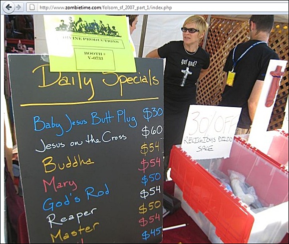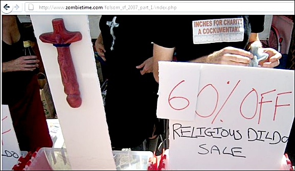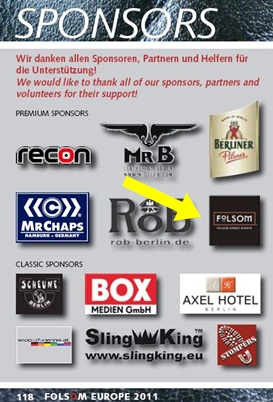 ![]() Aus dem "Folsom Europe"-Werbeheft 2011. Wowereit: "Folsom, das in San Francisco überaus erfolgreiche Festival der Fans von Lack und Leder, hat sich auch in Berlin durchgesetzt" (links, gelbe Markierung). Rechts: Im Werbeheft angegebene Sponsoren; Mitte rechts: "Folsom Street Events" als kalifornischer Monopolist. Die konservative amerikanische Internet-Seite "zombietime" zeigt Fotos vom "Folsom Street Fair"-Straßenfest in San Francisco 2007. Man sieht Kinder (echte Kinder, nicht nur religiöse Gotteskinder) in Fetisch-Klamotten rumlaufen zwischen Erwachsenen, die gerade auf der Straße Sex miteinander haben (was man in den letzten Jahren - ohne Kinder - auch schon auf der Berliner Fuggerstraße, dem Ort von Wowereits Sado- Maso-Straßenfest, sehen konnte). Und massenhaft Nackte mit Utensilien, wie man sie ähnlich auch beim Opus Dei - allerdings nicht sichtbar auf der Straße - trägt. Der Papst freut sich bestimmt besonders über das dort verkaufte Sex-Spielzeug in Form des Kreuzes, an dem Herrjesus hängt; sie sind unten wie Dildos ausgebildet, so- dass sie sich leicht reinschieben lassen. "Got God?", fragt eine Verkäuferin auf ihrem T-Shirt. (Und Papst Benedikt XVI. ergänzt im Ersten Deutschen Fernsehen in seinem "Wort zum Sonntag" vor seinem Deutschlandbesuch: "..., der so oft ganz abwesende Gott, dessen wir doch so sehr bedürfen.") Auch die dem Papst heilige Muttergottes gab es 2007 auf der für Wowereit so vorbildhaften "Folsom Street Fair" zum Reinschie- ben, und alles im Sonderangebot. In San Francisco ist die Mutterorganisation des Berliner "Folsom Europe e. V." also schon viel weiter beim Beherzigen von Escrivás Befehlen als in Berlin. Warum eigentlich demonstrieren die Berliner Sadomasochisten unter Führung des "Folsom Europe"-Vor- stands Robert Kastl gegen den Papst, statt - dem Wowereit-Grußwort gemäß - den kalifornischen Freund/innen nachzueifern? "Gebt es ihr in den