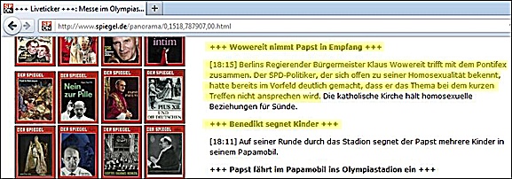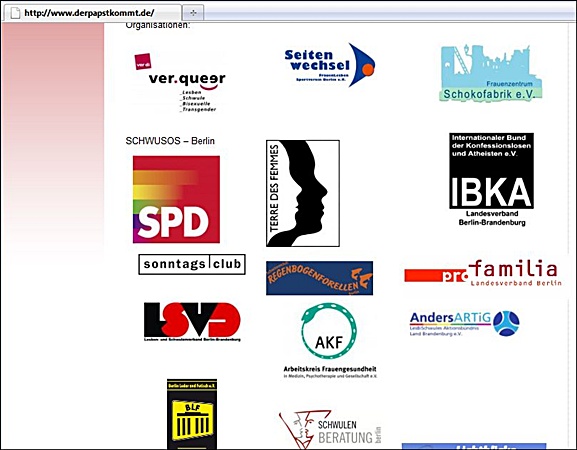 Gründen des Neuhei- dentums "Los von Rom!" wollen.(Heiliger Josemaría Escrivá) ![]() Auf die "inches" kommt es an, "for charity". Da freut sich der Papst! ![]() Ein "butt plug" ist ein Stöpsel für den Po, den Mann sich reinsteckt und dann mit dem Motorrad über Berlins Kopfsteinpflaster-Straßen fährt. So was (ohne Jesus, aber als Gartenzwerg) gibt es zum Beispiel beim Berliner "Folsom"-Sponsor "Mr B", um die Ecke vom Opus Dei. Ein "Baby Jesus Butt Plug" für nur 30 Dollar ist was für Anfänger, denen es noch weh tut. Der große "Jesus on the Cross" kostet das Doppelte. ![]() Das Zusammentreffen des Papstes mit Wowereit zeigt, wie tief das Papsttum seit dem Beginn des 19. Jahrhunderts gesunken ist: Chiaramonti, Pacelli, Ratzinger: "Mehr noch als der Preußengott hält es die römische Vernunft mit den stärkeren Bataillonen" (Horkheimer/Adorno, "Dialektik der Aufklärung"). Fascho gegen Fascho: Der verlogene Berliner Anti-Papst-Protest "Folsom Europe"-Vorstand und Berliner CSD-Chef Robert Kastl trat kürzlich im Radio (RBB, "radio eins", 8. August) als Sprecher des Berliner Anti-Papst-Bündnisses auf, das großes Aufsehen erregt. Kurz vorher dirigierte er noch Wowereit und andere Prominente, darunter den Berliner CDU-Chef Frank Henkel, beim CSD-Umzug. Das BIFFF... dokumentierte auch dies mit Fotos. In Kastls Bündnis "Der Papst kommt" sind über den "Internationalen Bund der Konfes- sionslosen und Atheisten" (IBKA), der hier neben dem Berliner CSD e. V. (ebenfalls vom Multifunktionär Robert Kastl geführt) und dem "Links"-Parteiflügel um die antisemitische Tageszeitung "Junge Welt" eine zentrale Rolle spielt, auch Nazi-Gruppen wie die "Deut- sche Unitarier Religionsgemeinschaft e. V." (DUR) und die "Freie Akademie e. V." (FA) erreichbar, mit denen der IBKA kooperiert. BIFFF...-Leiter Kratz: "Seit Jahren werfen wir dem IBKA vor, dass er mit jedem Nazi zusammengeht, wenn der nur auch gegen den Papst ist. Die neonazistischen sogenannten Kulturorganisationen - eigentlich müsste man von nazistischer Unkultur sprechen! - wie DUR oder FA oder auch die Gordano-Bruno-Stiftung der Euthanasie-Befürworter um Michael Schmidt-Salomon wurden zum Teil von Altnazis gegründet, beherben Neonazis und vertreten in großen Teilen die alte bekannte Nazi-Ideologie der Sigrid Hunke und der NSDAP-Chefideologen Alfred Rosenberg und Houston Stewart Chamberlain, wie ich in meinem Buch 'Die Götter des New Age' nachgewiesen habe." Machen wir also wieder mal eine Reise auf dem Rücken der Maus durchs Internet: jeweils nur ein Klick! Der Berliner "Tagesspiegel", der sich auf seiner Internet-Seite auch anderweitig mit Neonazis verlinkte, brachte schon im Juni 2011 einen direkten Link zum Bündnis "Der Papst kommt"; von dort ging es dann gleich weiter zu den Nazis: ![]() ![]() (BIFFF...-Screenshots von "Tagesspiegel.de" am 10. Juni 2011) Kritik beim "Tagesspiegel" gegen die Nazi-Verbindungen des Anti-Papst-Bündnisses? Die "Tagesspiegel"-Journalist/innen haben es nicht mal bemerkt! Klickte man auf den Link bei "Tagesspiegel.de", wie oben gezeigt, kam man zur Webseite des breitesten Bündnisses, von den rechts außen bekannten Berliner "Schwusos" bis zum IBKA der Nazi-Sekten: ![]() Klickt