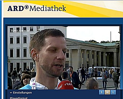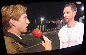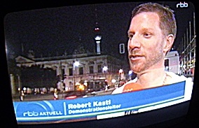 mit den Zwangs-Gebühren der Fernsehzuschauer/innen: Oben: Sado-Maso-Kastl einsam mit RBB-Breitfeld mittags beim Demo-Aufrufen. Hat nüscht jenützt: ![]() Die Demo, organisiert von Geschäftsmann Kastl mit seiner PR-Agentur "Publicom", die von Werbeeinnahmen lebt, sollte um 16.00 Uhr beginnen; um 17.30 Uhr sah die "Berliner Morgenpost" (oben) erst 2 500 der von Kastl erwarteten 20 000 Teilnehmer/innen. Um 18.00 Uhr sah der "Tagesspiegel" (unten) sogar nur 1 000: ![]() Die Reichweite der Werbung, sonst "Einschaltquote" genannt und minus Pinkel-Quote berechnet, hatte Kastl weit übertrieben. Damit es für seinen Kumpel nicht gar so ärmlich wirke, jubelte RBB-Arndt Breitfeld (unten links) nach dem Ende der Demo um 21.00 Uhr im zweiten Interview mit Kastl (rechts), das diesmal nur im RBB-Fernsehen ausgestrahlt wurde, nicht mehr im Ersten, die Zahl noch auf 4 000 hoch, "nach Polizeiangaben", wie Breitfeld sagte: So geht Werbefernsehen! Aufgeschreckt vom Geschäftsflop des Wowereit-Schützlings Kastl und vom Anruf von ganz oben, musste die Berliner Polizei an späten Abend, als alle Demonstrant/innen schon längst in der Disko waren, die Zahl nach oben korrigieren: auf dem leeren Bebel-Platz sollen es nun 9 000 gewesen sein. Mit Touristen? Kastl fälschte die 1 000 aus dem "Tagesspiegel" zwei Stunden nach Demobeginn noch auf "rund 12 000" hoch. Aber so viele kamen doch noch nie zu Demonstrationen von Rechtsextremen! (September