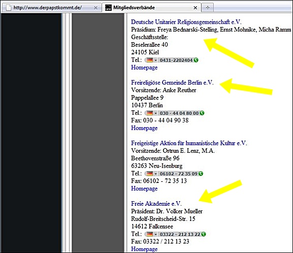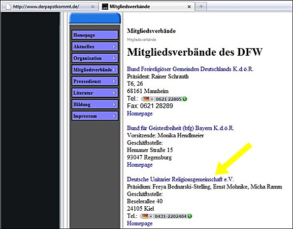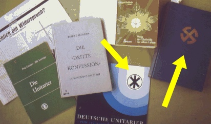 ![]() Klickt man auf den Link zum DFW (gelber BIFFF...-Pfeil; das geht natürlich nicht in unserem Screenshot, stupid, wir verlinken uns doch nicht zu Nazis!, das geht nur auf der Webseite des IBKA), dann kommt man zu den Mitgliedsverbänden des DFW, die ebenfalls als Links erscheinen: anklicken und im braunen Sumpf landen! ![]() ![]() Die "Deutsche Unitarier Religionsgemeinschaft e.V." (DUR), die wir nach einem Urteil des Berliner Kammergerichts "Nazi-Sekte" nennen dürfen, weil ihre Verbindungen zu Alt- und Neonazis "als Tatsache wahr" sind, dürfte bekannt sein. Die Geschichte der "Freireligiösen Gemeinde Berlin e.V." haben wir ebenfalls schon vor langer Zeit als rechtsextrem und pro-nazistisch geoutet; übrigens saß ihre heutige Vorsitzende Anke Reuther schon mal für die SPD im Berliner Abgeordnetenhaus. Die "Freie Akademie e.V." (FA) wurde von dem SS-Mitglied und Ideologen eines neopaganen, antisemitischen und hakenbekreuzten "Deutschen Glauben" Jakob Wilhelm Hauer gegründet; seine langjährige Mitarbeiterin und FA-Sekretärin, die Darmstädter Antisemitin Margarete Dierks, ging kürzlich heim ins Reich der germanischen Runen-Gänsefüßchen, Odin, Thor und Steinar sei's gepfiffen; beide waren auch der DUR eng verbunden. Auf unserer Literaturzusammenstellung unten erkennt man rechts mit dem runden Hakenkreuz von Hauers "Deutscher Glaubensbewegung" das antisemitische Hauptbuch Hauers, "Deutsche Gottschau", das zum Ideengeber von DUR und FA wurde. Die DUR schmückt sich mit der Hagalsrune (linker Pfeil): Inzwischen hat sich auch der sattsam rechtsaußen bekannte "Humanistische Verband Deutschlands" (HVD) dem Anti-Papst-Bündnis angeschlossen. Stolz stellte sich der HVD früher in seine Nazi-Tradition, das BIFFF... hatte es bekannt gemacht. Nun, diese Verbündeten gönnen wir dem Bündnis "Der Papst kommt", denn es wird angeführt von Leuten, die dem Nazi-Fetisch huldigen. Während