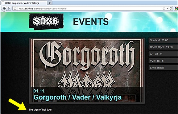 Nazi-Musik-Fest im "SO 36": mit den Kreuzberg-Nazis! Inzwischen haben die Fans von "Pagan Metal" (pagan = Heide, Anhänger der "nordischen" Mythologie), der "neuheidnischen" Krawallmusik aus Skandi- navien, und die Anhänger von Nazi-Runen-Symbolik im ehemals linken Szene- Club "SO 36" eine feste Heimstatt. Ausgerechnet auf dem christlichen Fest Allerheiligen, am 1. November, starten drei Bands aus der Neonazi-Szene hier ihre Europatour. Wie die MySpace- und YouTube-Seiten von "Gorgoroth", "Vader" und "Valkyrja" zeigen, geben die Bands das Vorfeld für allerlei Nazivolk ab, das sie als ihre "Freunde" aufführen. Der weitgehend unfähige Berliner Verfassungsschutz ist mal wieder ahnungslos. Als wir - wieder mal als