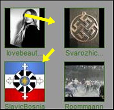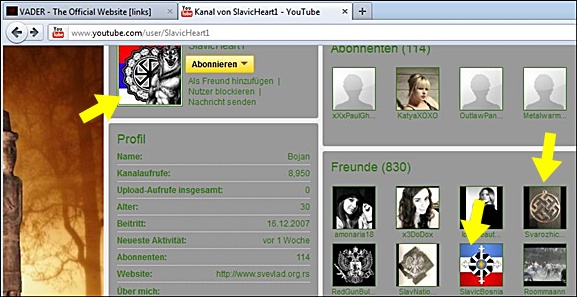 ![]() Eine Kombination aus Hakenkreuz und dem SS-Zeichen "Schwarze Sonne" fällt sofort bei den "Freunden" von "Vader" auf YouTube auf (oben; unten vergrößert): ![]() Es ist das Zeichen von "Slavic Heart". Klickt man drauf, werden auf der YouTube-Seite von "Slavic Heart" weitere Hakenkreuze verwendet. "Vader" bildet so das Vorfeld, verlinkt sich aber sogleich zu den Härte-Nazis: ![]() ![]() Weiter geklickt in dieser Szene, die im "SO 36" willkommen ist, kommt man sogleich zu noch mehr Hakenkreuzen, diesmal wieder abgerundet, ähnlich dem Zeichen, das die verbotene "neopagane" NS-Organisation "Deutsche Glaubenswegung" verwendete: ![]() In einem Filmbericht über russische Neonazis, den "Spiegel TV" zur Aufdeckung der Neonazi-Terroristen-Zelle "National-Sozialistischer Untergrund" (NSU) brachte, taucht das Zeichen von "Slavic Heart" als Symbol für russische Neonazis auf. Und auch der Wolf ist in unserer Vergrößerung der "Vader"-Freunde "Slavic Heart" (siehe oben) zu erkennen. Die direkte Verbindung der "SO 36"-Bands zum internationalen Neonazi- Terrorismus, die "Spiegel TV" allerdings entgangen ist, erscheint durchaus wahrscheinlich: (BIFFF...-Screenshot von der Internetseite "Spiegel TV", November 2011) Keine