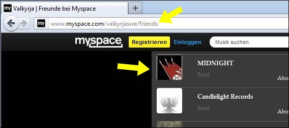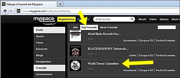 Nicht anders sieht auf der Webseite der dritten Band, "Valkyrja" aus Schweden, aus. Ihre Fans begrüßen sich im Internet mit "Heil!"-Ausrufen, die Band verlinkt sich mit der deutschen Gruppe "ObscuryS", deren Lied-Titel eindeutig sind: "Wir sind die Hass-Front", "Symphony of Sadism" oder "Macht und Dominanz". Auf der MySpace- Seite von "Valkyrja" findet man ebenfalls unter den "Freunden" der Band sogleich Nazi-Symbolik und die "Schwarze Sonne", die als Bodenmosaik, geformt aus der "Sig"- Rune der SS, aus der SS-Ordensburg "Wewelsburg" bekannt ist und hier erfunden wurde. Die "Schwarze Sonne" ist ein klassisches SS-Zeichen. "Freunde"