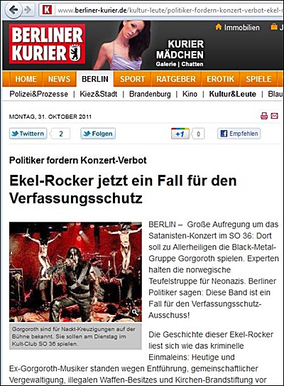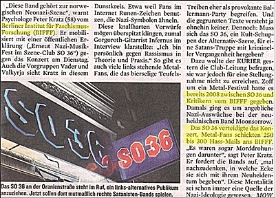 zwei Berichte zu BIFFF...-Recherche über Nazi-Musik im "SO 36" Während der Berliner Verfassungsschutz das Thema mal wieder verpennt, die Berliner Staatsanwaltschaft schon beim ersten "Pagan Metal"-Festival 2008 nichts gegen gesungene Nazi-Hetze in Kreuzberg unternahm, bringt das Boulevard-Blatt "Berliner Kurier" aus dem Verlagsimperium DuMont-Schauberg (u.a. "Berliner Zeitung", "Frankfurter Rundschau", "Mitteldeutsche Zeitung", "Kölner Stadtanzeiger", Kölner "Express", "Hamburger Morgenpost" am 30. Oktober 2011 einen zweiseitigen Bericht über die BIFFF...-Recherche zum neuerlichen Nazi-Musik-Fest im Berlin-Kreuzberger Szene-Club "SO 36". Wir zeigen einen Ausschnitt aus dem