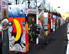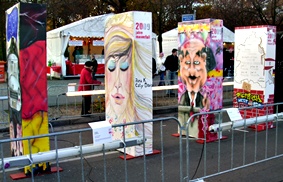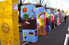 D-Day 2009: Die innerdeutsche Grenze als Kinderspiel, wie beim RTL-Domino-Day. Dass hier Menschen erschossen wurden, die einfach nur rüber zu ihrem Liebchen wollten, geht im Jahrmarkts-Getöse der 20-Jahr-Feier unter, bei der eine bemalte Styropor-Mauer nach dem Domino-Prinzip zum Einsturz gebracht wurde. Merkwürdige Symbolik -- was hier alles umfallen sollte! Fressbuden für deutsche Würstchen und ihre Esser gab's genug 2009 an der Kirmes-Mauer-Meile, nur die Schießbuden für die Mauerschützen und die, die es wieder werden wollen, fehlten: Und abends, als dieses seltsame Domino-Spiel begann -- ein Volk fällt um: ![]() ![]() ![]() ![]() ![]() ![]() ![]() ![]() |
