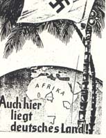 ![]() "Unsere Enge ist eine Hauptquelle unserer Nöte. Das deutsche Volk braucht Kolonien", meinte Konrad Adenauer in den 20er Jahren, als er Vizepräsident der Deutschen Kolonialgesellschaft war, die gerade ihrer Kolonien verlustig gegangen war; heute hängt sein Bild über dem Schreibtisch von Bundeskanzlerin Angela Merkel. "Unsere Pflicht ist es, vor allen Dingen in unseren Kindern die Erinnerung an unsere Kolonialepoche lebendig zu erhalten, damit sie später, wenn unsere Stunde wieder geschlagen hat, dasselbe oder wohlmöglich noch Besseres leisten als wir in den Jahren 1884 bis 1914", meinte 1924 ein bremischer Kaufmann, und 1927 befand der Bremer Senat, der sich immer noch als Sachwalter des deutschen Imperialismus verstand: "Deutschland braucht für seine Entwicklung eigene Produktions- und Absatzgebiete. ... Bremen hat nicht vergessen, daß Kolonien eine nationale und wirtschaftliche Notwenigkeit sind." Was 1884 die Berliner Afrika-Konferenz war, die damals noch "Kongo-Konferenz" hieß, ist 2001 die Bonn-Petersberger Afghanistan-Konferenz. Daß die Bundeswehrsoldaten "am Hidukusch" Kopfbedeckungen tragen, die sich an die "Südwester" ihrer kaiserlichen Vorgänger in Afrika anlehnen, ist eine gelungene Demonstration. Wo Siedler deutsche Namen