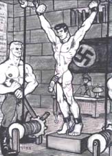 Wirklichkeit (rechts): Bagatellisierung der NS-Verbrechen. Psychopathische "Fetisch-Sex"- Zeichnung von einer schwulen Nazi-Internetseite in England, zu der man im August 2006 über die Webseite des "Folsom Europe e.V." gelangte: an der Grausamkeit des Nazi-Terrors sollen sich Schwule beim Sex erfreuen. Im Januar 2007 sind neben dem Folsom Europe e. V. auch der "Berlin Leder und Fetisch e. V.", der das alljährliche Berliner "Ostertreffen" schwuler Skinheads veranstaltet, und der internationale Fetisch-Laden "ROB" (Filiale in Berlin-Schöneberg), der die gesamte Gewaltsex-Szene über Sponsoring mit finanziert, Teil der Internet-Link-Kette zu dieser englischen Schwulen-Nazi-Seite. Das Betrachten der Zeichnung soll geil machen und zum Nachspielen anleiten. Inzwischen sind hier auch Hitler-Bildchen, NS-Propagandaplakate mit Hitler-Jungen, BDM-Mädchen und Wehrmachts-Soldaten und weitere pornographische Zeichnungen mit SS-Leuten zu sehen, die in SS-Uniformen auftreten und mit ihren SS-Rängen bezeichnet werden.