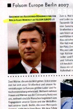 neuerlichem "Folsom Europe"-Grußwort ? Edin Kovacs/Karovic hat USA-Einreise-Verbot -- Ausgerechnet jetzt, kurz bevor er sich mit seiner "Autobiographie" selbst ein Denkmal zu setzen versucht, holt den Regierenden Bürgermeister von Berlin, Klaus Wowereit (SPD), seine jahrelange bedingungslose Unterstützung für die Gewaltsex-Szene wieder ein. Am 1. September 2007 ist wieder "Folsom Europe Berlin"-Straßenfest auf der kleinen Straßenkreuzung Fuggerstraße/Welserstraße in Berlin-Schöneberg. Fast nur schwule Sado-Maso-Kneipen und die Geschäfte fürs Zubehör (Peitschen, Masken, Nazi-Stiefel mit weißen Schnürsenkeln, Folter-Sex-Filme usw.) machen ein paar Verkaufsstände, fettige Nackenkoteletts qualmen auf dem Grill und mittelmäßiges Berliner Lokalbier fließt in Strömen. Und Klaus Wowereit hat trotz des riesigen Skandals 2005 auch jetzt wieder ein Grußwort im Werbeheft für das Straßenfest der Gewaltsex-Szene geschrieben: "Gemeinsam feiern und sich freuen ... sich wohlfühlen in dem attraktiven Kiez zwischen Nollendorf- und Wittenbergplatz ... traditioneller Platz ... genau die richtige Kulisse für das Treffen der europäischen Leder- und Fetischszene. Alle Teilnehmerinnen und Teilnehmer am 4. FOLSOM EUROPE heiße ich herzlich in Berlin willkommen und wünsche ihnen ein schönes Fest und einen angenehmen Aufenthalt in Berlin". Ja, es stimmt: diese Gegend hat Tradition, von Ernst Röhm bis zu den heutigen Nazi-Stiefel-Läden. Doch diesmal kann die Szene noch eins drauf setzen. Nicht genug damit, dass in dem "Folsom Europe"-Werbeheftchen erneut Männer in typischen Neonazi-Klamotten posieren. Nicht genug mit den weiter bestehenden Internet-Verbindungen bis zu Neonazis mit Hitler-Bildern, zu Gewalttätern mit Waffen und Internet-Waffenhändlern.Drei