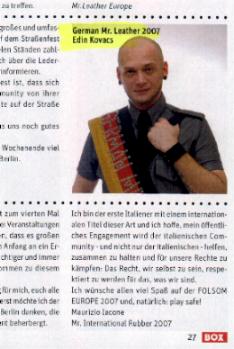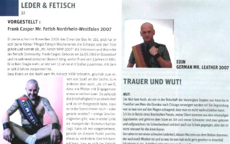 Das alles reicht noch nicht. Nun hat auch noch der "German Mister Leather 2007", ein - nach eigenen Angaben - Moslem vom Balkan, der unter verschiedenen Namen auftritt (mal als Edin Kovacs, mal as Edin Karovic) und der eine Art Repräsentant der Fetisch-Szene abgibt - der "German Mister Leather" wird alljährlich in Berlin vom "Berlin Leder und Fetisch e. V.", der mit dem "Folsom Europe e. V." eng verbunden ist, neu gewählt und ruft gemeinsam mit Wowereit in "Box" zum Besuch des "Folsom Europe"-Straßenfestes auf - Einreise-Verbot in die USA. In "Box" vom Juli 2007 schrieb Kovacs/Karovic selbst als einzige "Begründung" für sein Einreiseverbot, dass er "Moslem" sei und "einen bosnischen Pass" habe (was immer das nach den Änderungen im Staat Bosnien-Herzegowina sein soll, wo heute alle Reisedokumente aus der Zeit vor 2002 ungültig sind!), und: "Ich könnte ja ein 'Schläfer' sein oder gar ein Terrorist!", deshalb ließen die USA ihn nicht rein. Aber in "Box" ruft er gemeinsam mit Wowereit auf zwei gegenüberliegenden Seiten zum Besuch des "Folsom Europe"-Festes auf! Den USA nicht geheuer "WUT!" überschreibt BLF-"German Mister Leather" Edin diesmal seine monatliche "Box"-Kolumne. Der Text verdient es, im Zusammenhang zitiert zu werden (Rechtschreibung wie im Original): "Die Wut kam hoch, als mir in der Botschaft der Vereinigten Staaten von Amerika in Frankfurt am Main" (offenbar meint er das Generalkonsulat) "die Einreise nach Chicago verweigert worden ist! Die Begründung war so was von auf den Magen schlagend, das man es nicht nachvollziehen kann. Ich bin im Besitz eines Bosnischen Passes, meine Eltern kommen aus dem ehemaligen Jugoslawien und gehören dem Islam an. Ich und meine Schwester sind zwar geboren und aufgewachsen im Schwabenland und dort auch zur Schule gegangen, aber das ist nicht relevant für die Amerikaner.Sie sahen in mir einen schwulen Lederkerl, dessen Wurzeln aus dem Balkan stammen, der auch noch Moslem ist und so was ist nun mal nicht gern gesehen in Amerika! Ich könnte ja ein 'Schläfer' sein oder gar ein Terrorist! Als ob ich nicht genug eigene Probleme hätte." Bemerkenswert an dem