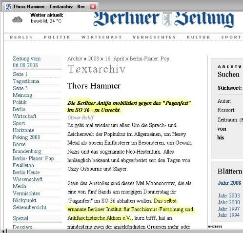 "Berliner Zeitung" setzt sich für rechtes "Paganfest" ein und kritisiert das BIFFF... Wer ernannte eigentlich die "Berliner Zeitung", die schon längst in der Hand eines britischen Hedgefond ist, zur "Berliner" Zeitung? "Das selbst ernannte Berliner Institut für Faschismus-Forschung und Antifaschistische Aktion e.V.", schreibt eine so genannte "Berliner Zeitung" am 16. April 2008 über den BIFFF...-Protest gegen das rechtsextreme "Paganfest" im bisher linken Club "SO 36" und schlägt sich auf die Seite der Neuheiden. Leider ohne viel Sachkenntnis des "Berliner Zeitungs"-Autoren, eines Oliver Rohlf ("37, früher in der Musikbranche", heißt es im Internet über ihn, heute ist er Zuckerbäcker), der gleich am Anfang seines Artikels meint, Nazi-Vorwürfe gegen Teile der Hard-Rock-Musikszene seien doch "hinlänglich bekannt und abgearbeitet seit den Tagen von Ozzy Osbourne und Slayer". Allerdings machte "Black Sabbath" erst mehr als ein Jahrzehnt nach Osbournes Ausscheiden ein Album mit nordischer Mythologie, und "Slayer" mit Ozzys Verfremdungen gleich zu setzen, zeigt, wie fremd der Bühnengeist Brechts den Stasi-Überbleibseln heute ist. Dass die Redakteure der früheren SED-Bezirkszeitung "Berliner Zeitung" und auch ihre neuen West-Kollegen hier nicht einschritten, sei ihnen verziehen, denn immerhin hatte sogar der harmlose Udo Lindenberg Durchfahrtverbot auf der DDR-Transitautobahn nach Berlin (West); von Rockmusik wusste die Stasi eben noch weniger als von den Nazis in der DDR.