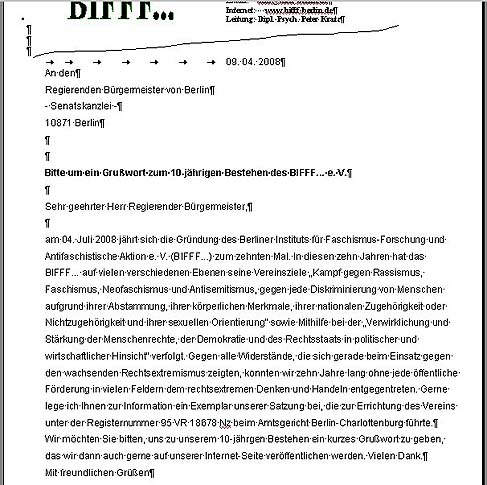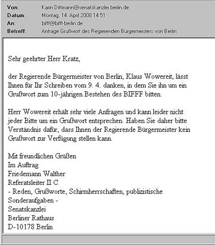 10 Jahre BIFFF... e.V. --- Wowereit verweigert Grußwort Grußworte hat Berlins Regierender Bürgermeister Klaus Wowereit für dies und dass, vor allem dann, wenn Sex und Gewalt zusammen gehen, wie beim "Folsom Europe Berlin"-Straßenfest, das gleich nach einem Jahr mit dem berühmt-berüchtigten Wowi-Grußwort "Lebensfreude pur!" geehrt wurde. Das BIFFF... geht dagegen leer aus. Zuerst fragten wir freundlich an, und auch rechtzeitig: Dann kam die wenig freundliche Antwort aus der Senatskanzlei: Jetzt sind wir aber echt sauer ! ...zurück zur Übersicht: Neue Herausforderungen