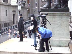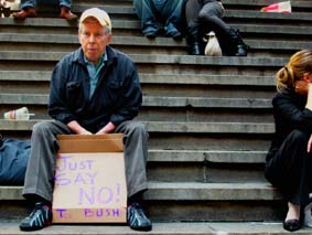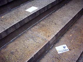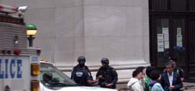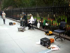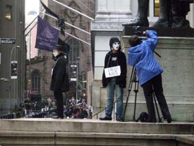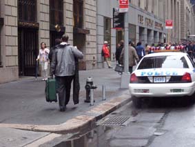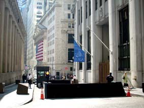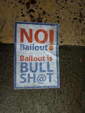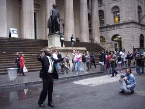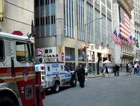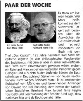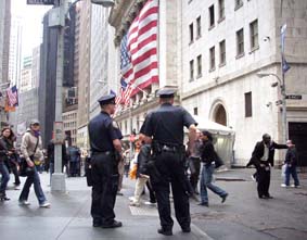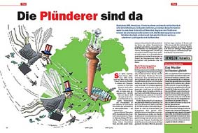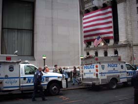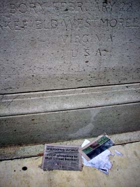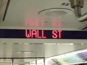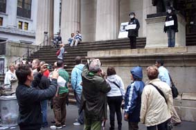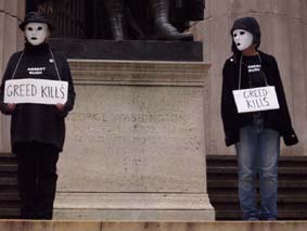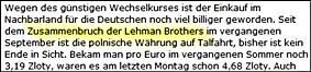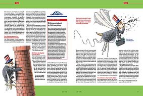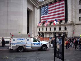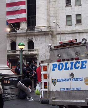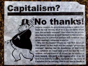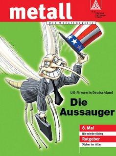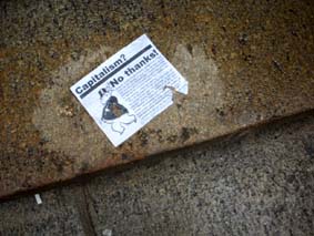 "DO NOT ENTER": Die Wallstreet ist im Herbest 2008 eine Baustelle, und auch die Broad Street, an der die Schauseite der New York Stock Exchange liegt, die seit dem September 2001 mit der Fahne der USA verhüllt ist und die nur den Ausgang der Börse darstellt, ist gesperrt. Zwanzig Meter unter Null: Ausstiegsanzeige in einem Wagen der größten Untergrundbahn-Flotte der Welt, "MTA Subway" von New York Ciy, am U-Bahnhof Wall Street. Die "Metropolitan Transportation Authority MTA" mit ihren zahlreichen Transportsystemen im US-Bundesstaat New York ist ein ideologisches Vorbild: Privatanleger zeichnen Bonds ohne Stimmrechte, die Unternehmensentscheidungen fällen staatlich ernannte Gremien, City und State schießen Steuergelder zu. Die Ratings der Wertpapiere der durch die Finanzkrise schwer bedrängten MTA gehen zur Zeit von "A" bis "AA". Mit Gott und Polizei: Der schwarze Prediger (ganz rechts) heißt Reverent Basiru A. Gbadamosi und nennt sich "Pastor & Prophet". Er hat an den Tagen der ersten Crashs im Sepember seinen Auftritt an der Wall Street: "Jesus, Jesus kommt!", brüllt er in einem fort und verteilt Flyer der "Champions Church": "New Beginning! I know you agree with me that we all have enemies that's always want evil things to happen to us: bad luck, trouble, poverty, sickness, even death. Find out how you can win over them at all. To be successful in life you need to win over your enemies. Join us and you will win over them all in Jesus name." Wenn Jesus nicht mehr helfen kann: Schwer bewaffnete Polizeieinheiten mit Stahlhelmen, Maschinenpistolen und schusssicheren Westen bewachen in diesen Tagen die New York Stock Exchange an der Wall Street. Nicht einer ... ... nicht zwei ... ..., an allen Seiten stehen zahlreiche Einsatzwagen in den engen Gassen des Bankenviertels von Manhattan, um das Zentrum des Kapitalismus absichern: Groteske versenkbare Straßensperrren sind hochgefahren worden, damit niemand zum ökonomischen Zentrum durchbrechen kann: Selbst kleine Seitenstraßen hinter der Börse können derart abgesperrt werden ... ... damit die bankrotten Broker ihre Akten und Anzüge sicher nach Hause bekommen, wenn sie denn noch ein Zuhause haben: Protest mit Bibel und Workers Party: Nicht nur Rev. Gbadamosi (links im Vordergrund) wird zur Attraktion für Touristen, die in Krisenzeiten zur Wall Street kommen im Glauben, Kapitalismus könne man sehen. Die beiden Figuren zu Füßen von George Washington vor der Federal Hall (deren Schauseite im Gegensatz zur Börse tatsächlich an der Wall Street liegt, wo Washington seinen Amtseid als erster Präsident der USA ablegte) mit ihren Protestschildern sind die meist fotografierten Personen dieser Tage: Ihre Botschaft ist biblisch: "Gier tötet". Und sie scheinen von den Medien bestellt zu sein, die Bilder über einen Protest gegen den Kapitalismus brauchen; aber diesen Protest gibt es nicht wirklich. Linke Splittergruppen versuchen sich mit Pamphleten gegen den "Bailout", die Kautionsrettungzahlung des Staates fürs Kapital, doch es ist mehr Folklore, wenn die Zeitung "Workers World" an Washingtons Denkmalssockel regennass wird: Keine Wirtschaftskrise ohne die Workers Party! Protest im Stil der 20er Jahre auf den Stufen der Federal Hall: Der Kapitalist als fettes Schwein. In dem Flugblatt heißt es: "People say that Wall Street got 'too greedy' or that there was not enough 'government oversight' ignoring that the foundations of Wall Street and capitalism are based upon greed and that the Government, and politicians of all stripes, are the enablers of these bastards who profit at the expense of all of us." Manchmal reicht ein einfaches Schild, um Washington gegen Bush ins Feld zu führen. Es nützt genauso viel wie der Jesus-Appell: Was kümmert es die Schuhputzer an der Ecke Wall Street / Broadway mit ihrem selbst gebauten Equipment, solange die feinen Damen nur die Highheels herhalten! Die berüchtigte "Heuschrecken"-Ausgabe der Mitgliederzeitung der Industriegewerkschaft Metall: ![]() ![]() Marx macht mobil: ![]() Das weit verbreitete TV-Programm-Heftchen "prisma. Wochenmagazin zur Zeitung", das vielen deutschen Tageszeitungen beiliegt, brachte diesen Marx-im-Doppelpack-Schnipsel in seiner Weihnachtsausgabe 2008 auf Seite 3. Keine Werbung für "Dabbeljuh" ... ... sondern alter symbolträchtiger Wandschmuck in der Subway-Station Wall Street downtown Manhattan. So sähen die europäischen Rackets die USA gerne, zerfetzt: Stars and Stripes im Strumgewitter auf einer Filiale der krisengeschüttelten US-Sparkasse "Washington Mutual" an der Grand Street in Williamsburg/Brooklyn. Monate, nachdem wir auf den verbreiteten Antisemitismus als "Erklärung" für die Krise, die in Wahrheit zu großen Teilen eine ganz normale Überproduktionskrise des Kapitalismus ist, hingewiesen hatten (siehe im Text oben: "Haltet den Dieb!"), traut sich Anfang März 2009 "Der Spiegel", der auch in der Vergangenheit schon durch antisemitisch konnotierte Titelbilder auffiel, die Welt und die Juden assoziativ auf den Titel zu bringen: ![]() Juden stecken die Welt in Brand: so perfide stellt "Der Spiegel" die vermeintliche Ursache einer Krise dar, die von den ganz normalen Gesetzen des kapitalistischen Wirtschaftens verursacht wurde. Nicht ein Unternehmen, nicht viele Unternehmen, die als Unternehmen benannt werden, erst recht nicht die universalen Verwertungsgesetze des Kapitals, sondern jüdische Menschen,"die Lehman Brothers", sind für "Spiegel online" schuld an der weltweiten Krise: "Seit dem Zusammenbruch der Lehman Brothers im vergangenen September ist die polnische Währung auf Talfahrt, bisher ist kein Ende in Sicht", schreibt "Spiegel online" am 7. März 2009: ![]() Zusammengebrochen ist nicht zum wiederholten Male ein System, das für den Profit der Reichen auch über Leichen geht, sondern zusammengebrochen sind, glaubt man dem "Spiegel", jüdische Individuen. Und in Deutschland wird wieder "Kultur" gemacht wie gehabt: Sprühkunst auf einer Kreuzberger Hausw