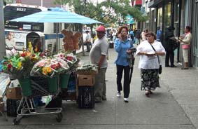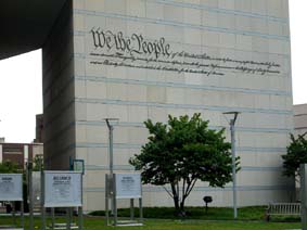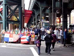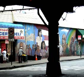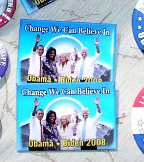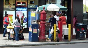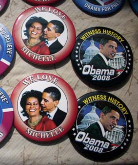 "Witness" für was? "His family didn't come in chains!", kritisiert die alte linke Bewegung der "Black Politics". Obamas kenianischer Vater kam als Student und ging wieder als examinierter Akademiker. Euphorie und Euphemismus: ![]() Die Zeitungen feiern das Ende des Rassismus. 800 Dollar kostet ein Original dieser Siegesausgabe der "New York Times" vom 5. November 2008 inzwischen im Internet bei Versteigerungen, weil sie von dem historischen Ereignis zeugt -- in der Bronx müssen schwarze Familien von diesem Betrag zwei Monate lang Essen und Miete bezahlen, in Brooklyns Latino-Ghetto Bushwick entspricht er einer Monatsmiete, wenn man Glück hat und das Haus baufällig ist, sonst muss man doppelt so viel bezahlen. Mit dem Bild ihrer Zeitung (oben) warb die New York Times auf ihrer Internetseite für ein Reprint (Preis: 14,95 Dollar), konnte dann aber wegen des Ansturms nicht liefern. "We the People ..." -- museumsreif: "... yes, we can!" Das neue "National Constitution Center" im "Independence National Historical Park", dem weiträumigen, kürzlich neu gestaltete Campus der US-amerikanischen Unabhängigkeits-Geschichte in Philadelphia, ist ein Museum für die Werte der Amerikanischen Verfassung. Rechts auf der Fassade stehen .... ... in Stein gehauen und in originaler Dokumentenschrift die Anfangsworte der schwer strapazierten Verfassung der Vereinigten Staaten von Amerika aus dem Jahr 1787, die gegenüber in der "Independence Hall" unterzeichnet wurde. Wahlurne Nummer 52, die bei der Präsidenenwahl im Jahr 2000 in Florida dem Kandidaten George W. Bush dienlich war; jetzt im Verfassungsmuseum aufgestellt. Keine Chance auf Designer-Klamotten: Überleben unter der Hochbahn in Brooklyns Ghettos der Schwarzen und Hispanics. Kleidung kauft man im "99 Cent"-Shop (oben, links), Gemütlichkeit und Trost sucht man mit Fähnchen aus der alten Heimat und in Wandmalereien der armen Einwanderer (unten). Ein bisschen Geld zusätzlich zur Stütze und den Lebensmitelmarken vom Staat, mit denen hier mehr als die Hälfte der Bevölkerung ihre Essenseinkäufe bezahlt, kommt aus dem illegalen Straßenverkauf von Melonen- oder Mango-Stücken aus Pappkartons (unten links), schnell aufgebaut neben dem ebenfalls nicht angemeldeten Würstchenstand (rechts), der auch nur provisorisch aussieht, und schnell abgebaut ist, sollte tatsächlich mal Polizei vorbei kommen: Oder man verkauft ein paar Blumen aus dem "geliehenen" Supermarkt-Einkaufswagen, mit dem man auch schnell wieder weg ist im Polizei-Notfall (unten): Mit Repräsentanten der weißen Mittelklasse: Farben übergreifend: Als politisch unbeschriebenes Blatt ist die neue Charaktermaske, der man einen lange bewährten Vertreter der eigenen Interessen zur Seite gestellt hat, vom US-Kapital universell einsetzbar. (Anstecker aus der Wahlkampagne) |